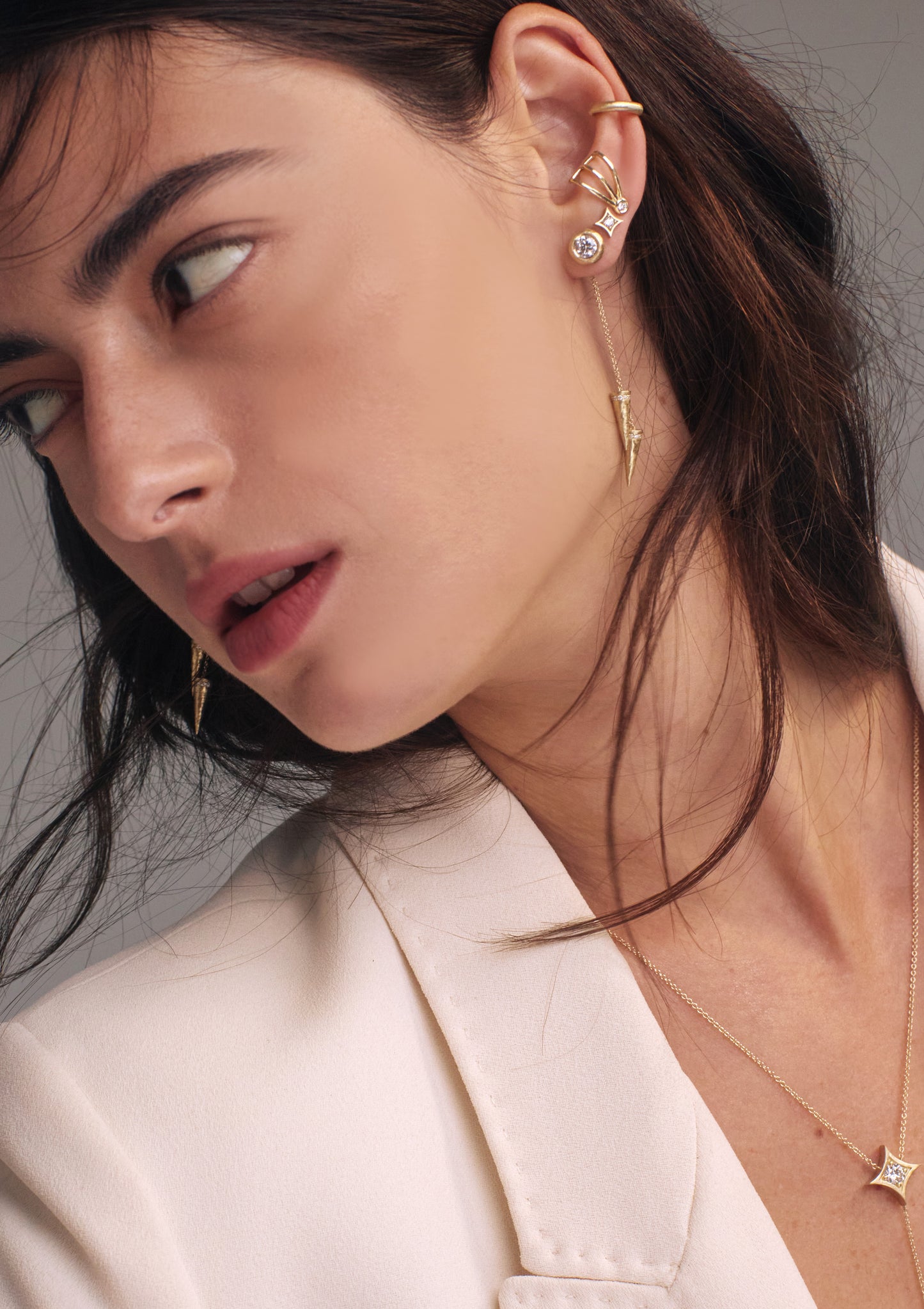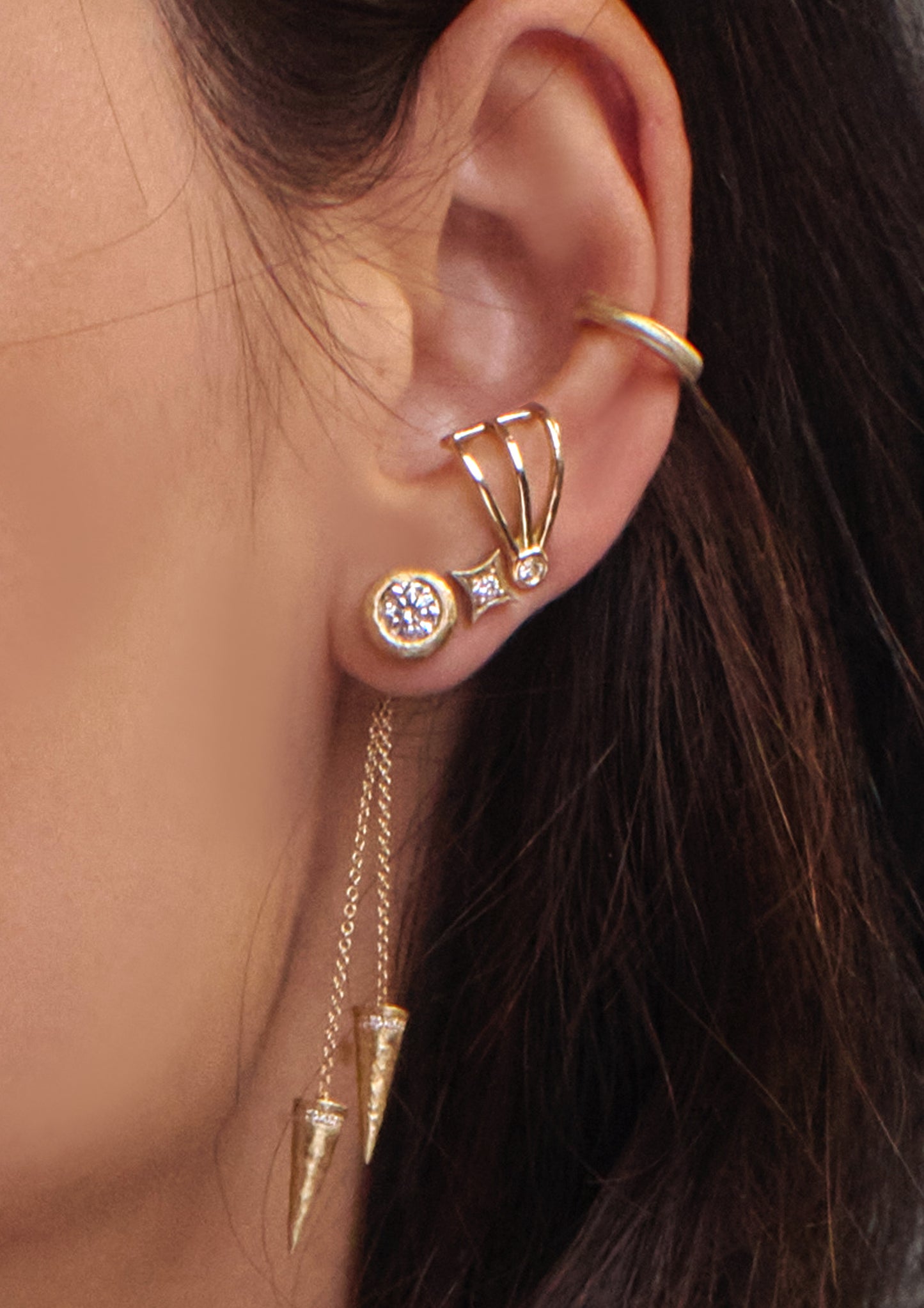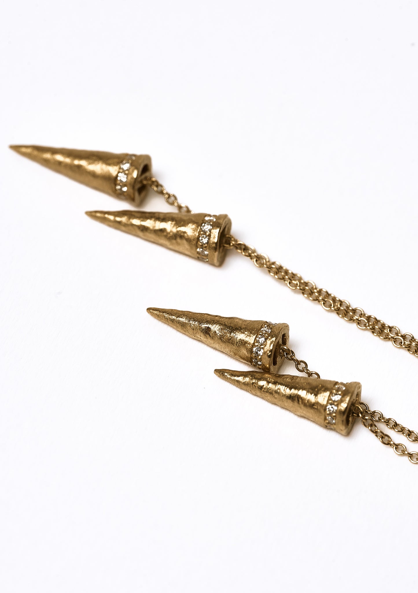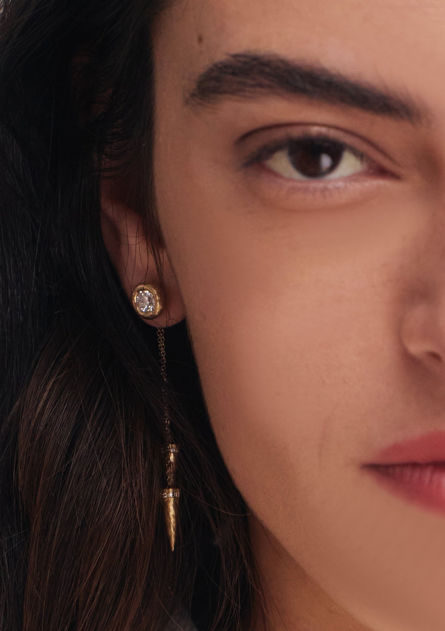 The Nora Earrings are a striking fusion of elegance and edge. Featuring brilliant round-cut diamonds set in softly textured gold studs, they cascade into twin delicate chains that suspend sculptural cone-shaped drops adorned with subtle pavé detailing. The design balances raw artistry with refined movement, creating a captivating play of light and texture. A perfect statement piece for the modern muse who embraces both strength and grace.