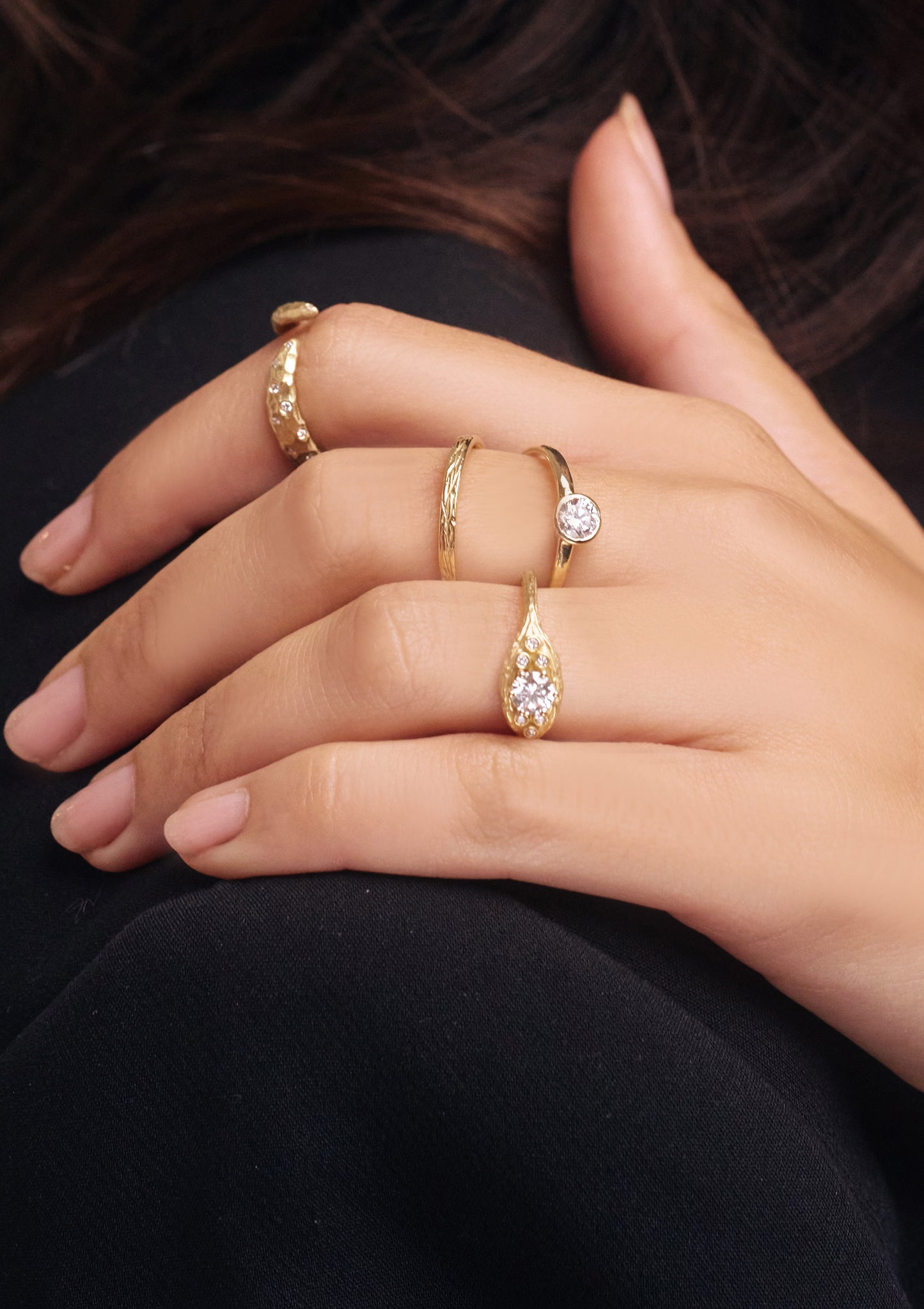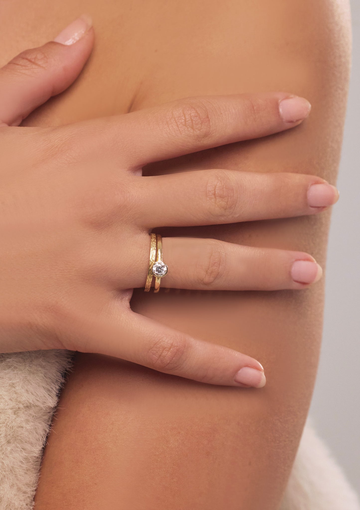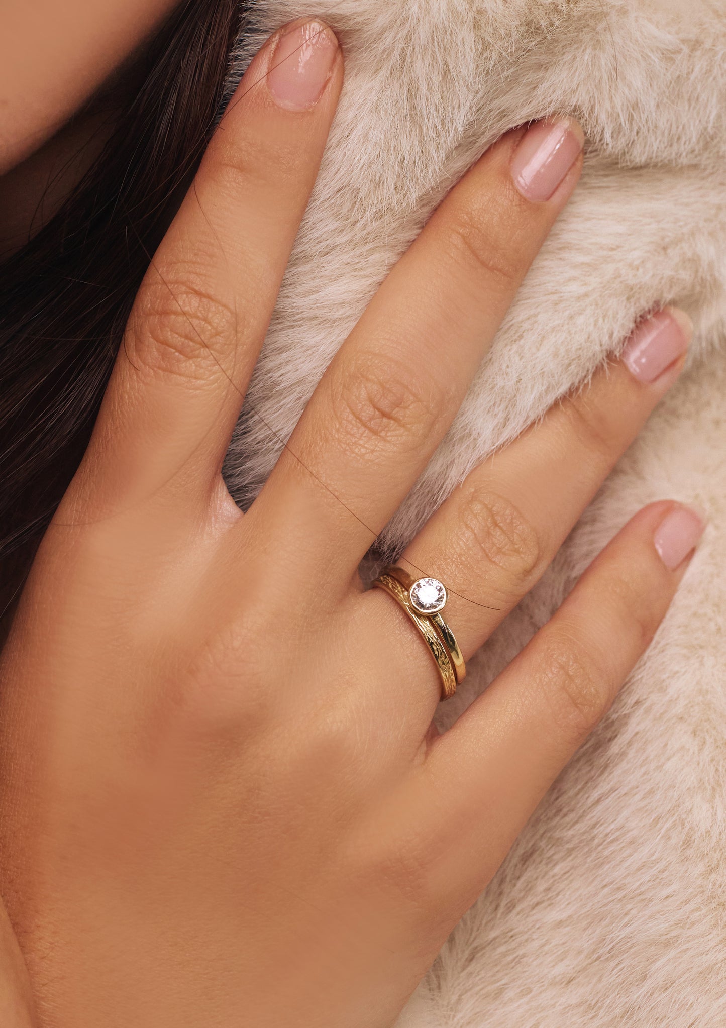 The Vera Ring is a refined creation of effortless elegance. A single round diamond is set in a smooth bezel of polished gold, radiating timeless simplicity. Designed with a slender band, it shines as a graceful piece