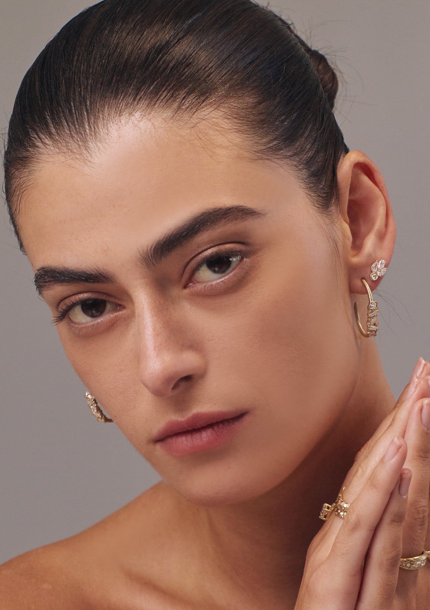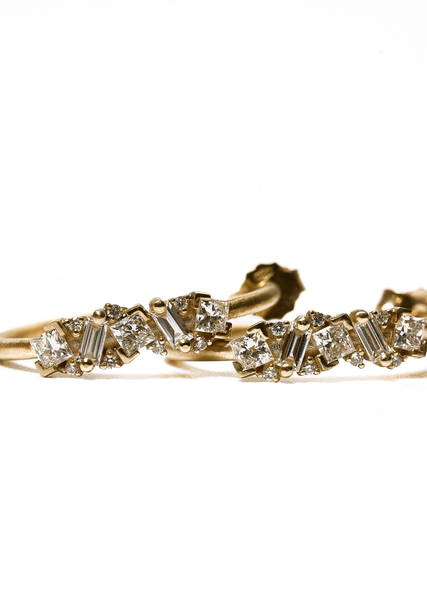 The Adora Hoops redefine classic elegance with a sculptural twist. Crafted in textured gold, these medium-sized hoops are adorned with an alternating arrangement of baguette and princess-cut diamonds, each set in a handcrafted bezel that highlights their geometric brilliance. The organic matte finish contrasts beautifully with the diamonds’ precise sparkle, creating a balance of refined craftsmanship and natural allure — a timeless statement of modern romance.
