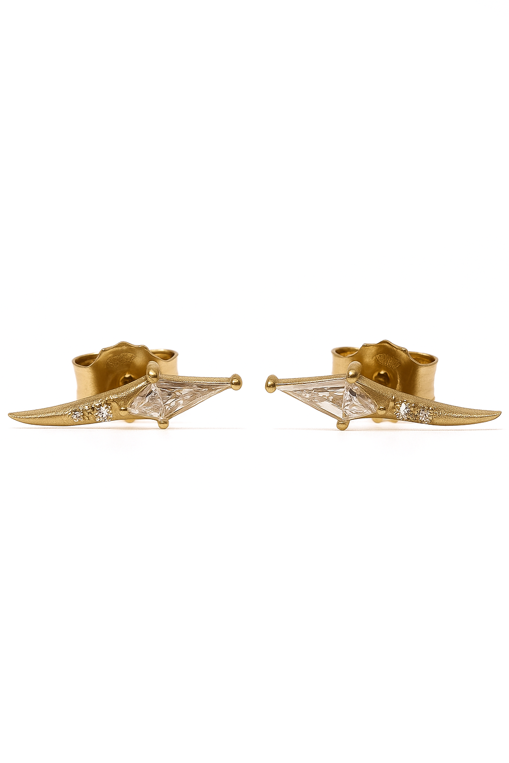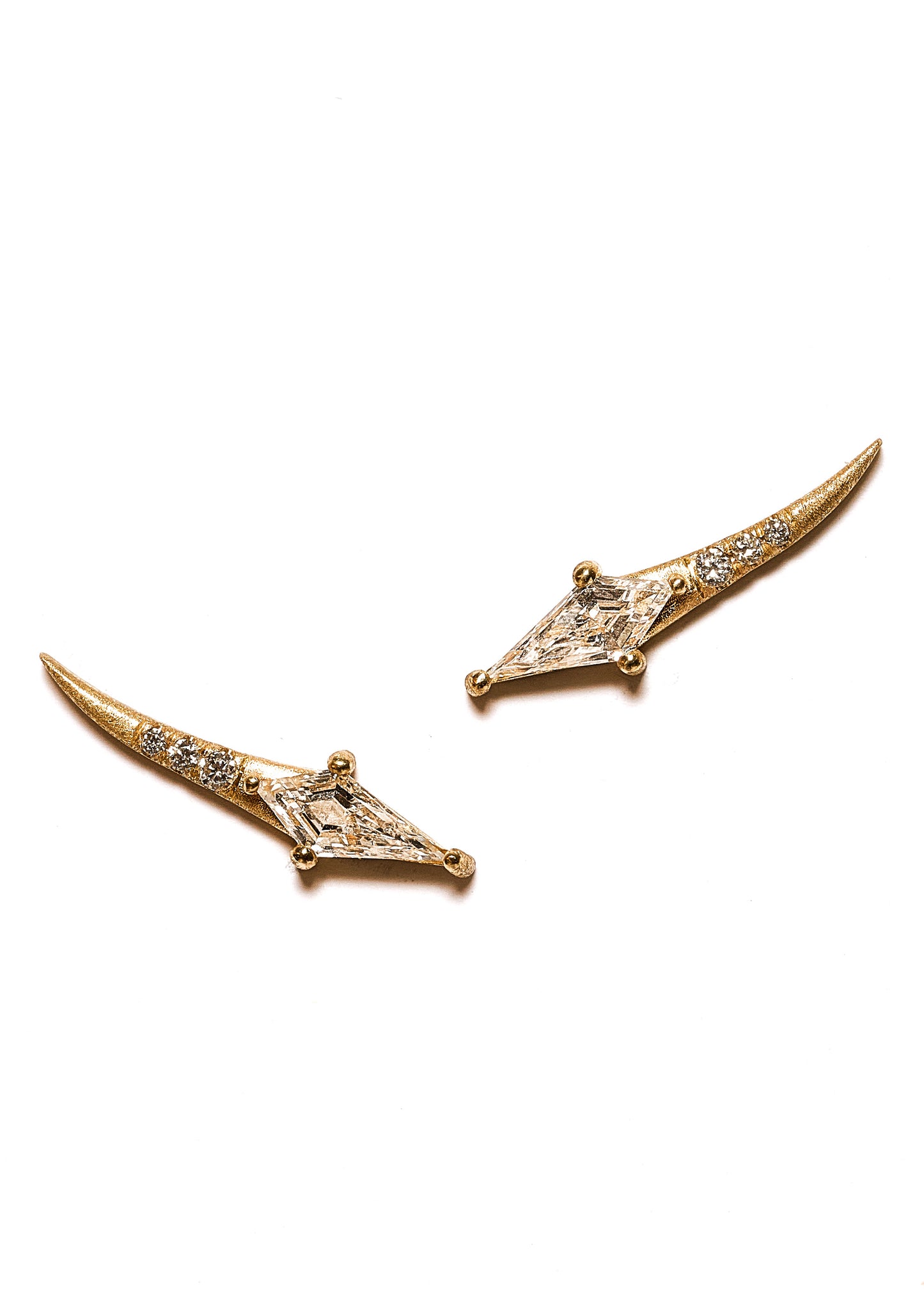 The Ellie Earring is a striking balance of geometry and flow. A marquise-cut diamond rests at the center, set in sculpted hammered gold that extends gracefully along the ear. A trail of smaller diamonds adds a touch of shimmer, enhancing the piece’s natural movement and light. Artistic yet refined, it’s a contemporary design that radiates quiet strength and elegance.