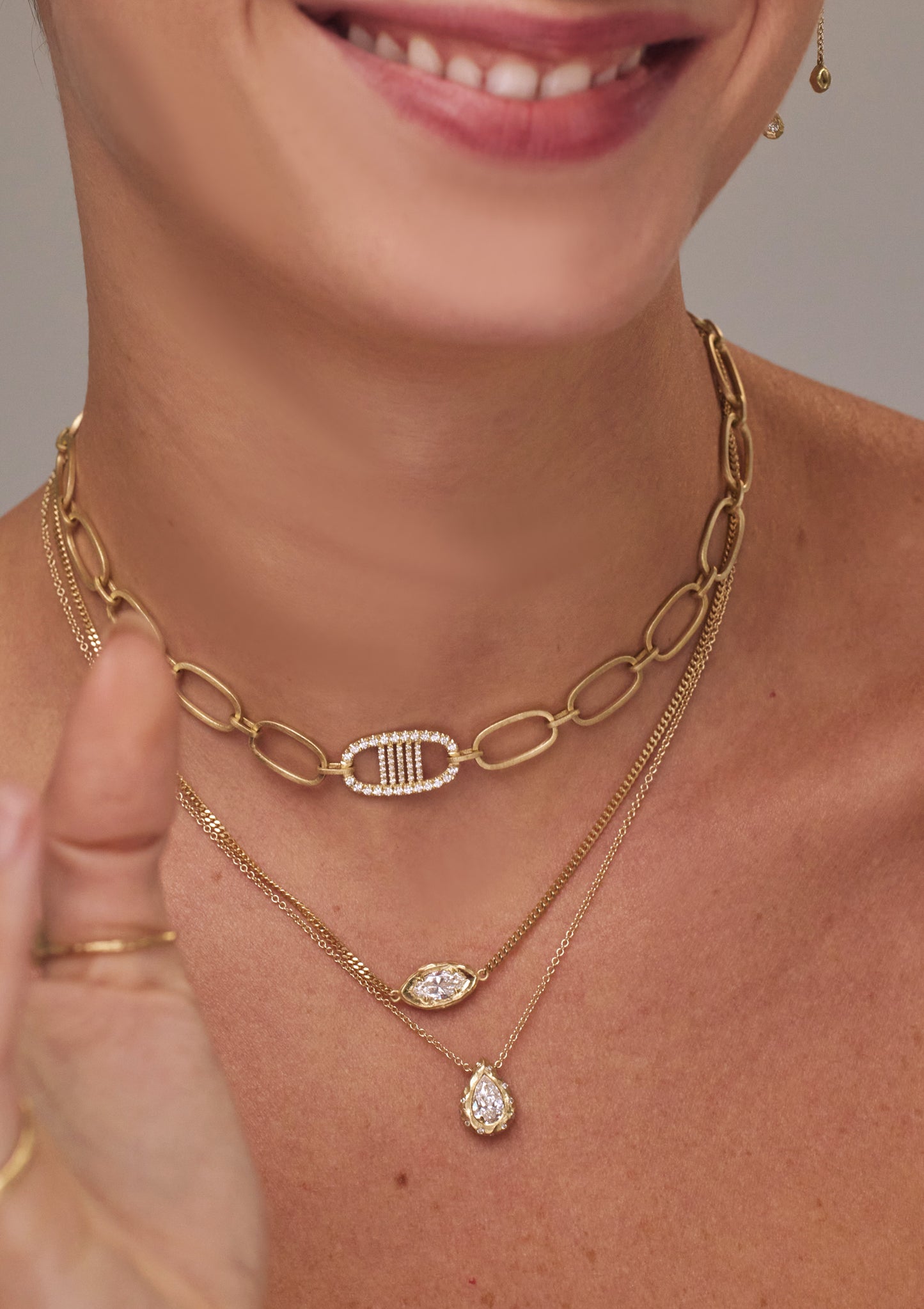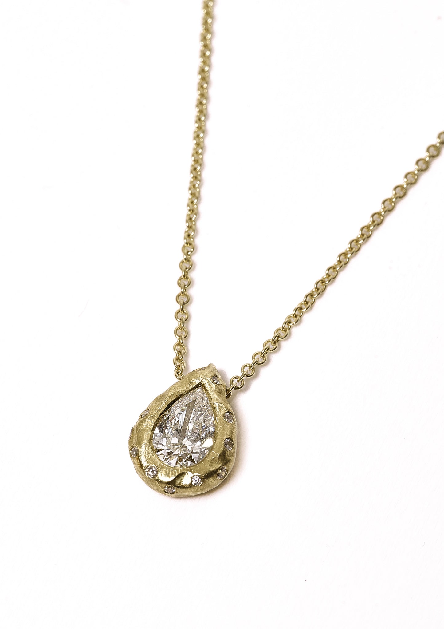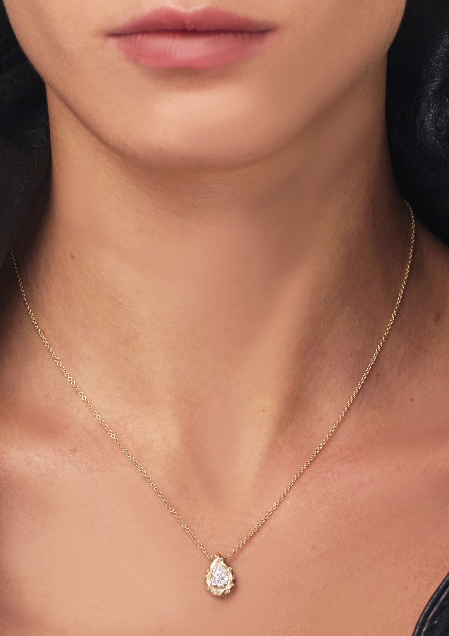 The Clara Necklace is a luminous creation of pure elegance. A pear-shaped diamond rests at its center, framed by a sculpted, hammered gold bezel that glows with warmth and artistry. Suspended from a fine gold chain, it captures the balance between organic beauty and refined sophistication—a timeless piece for every occasion.