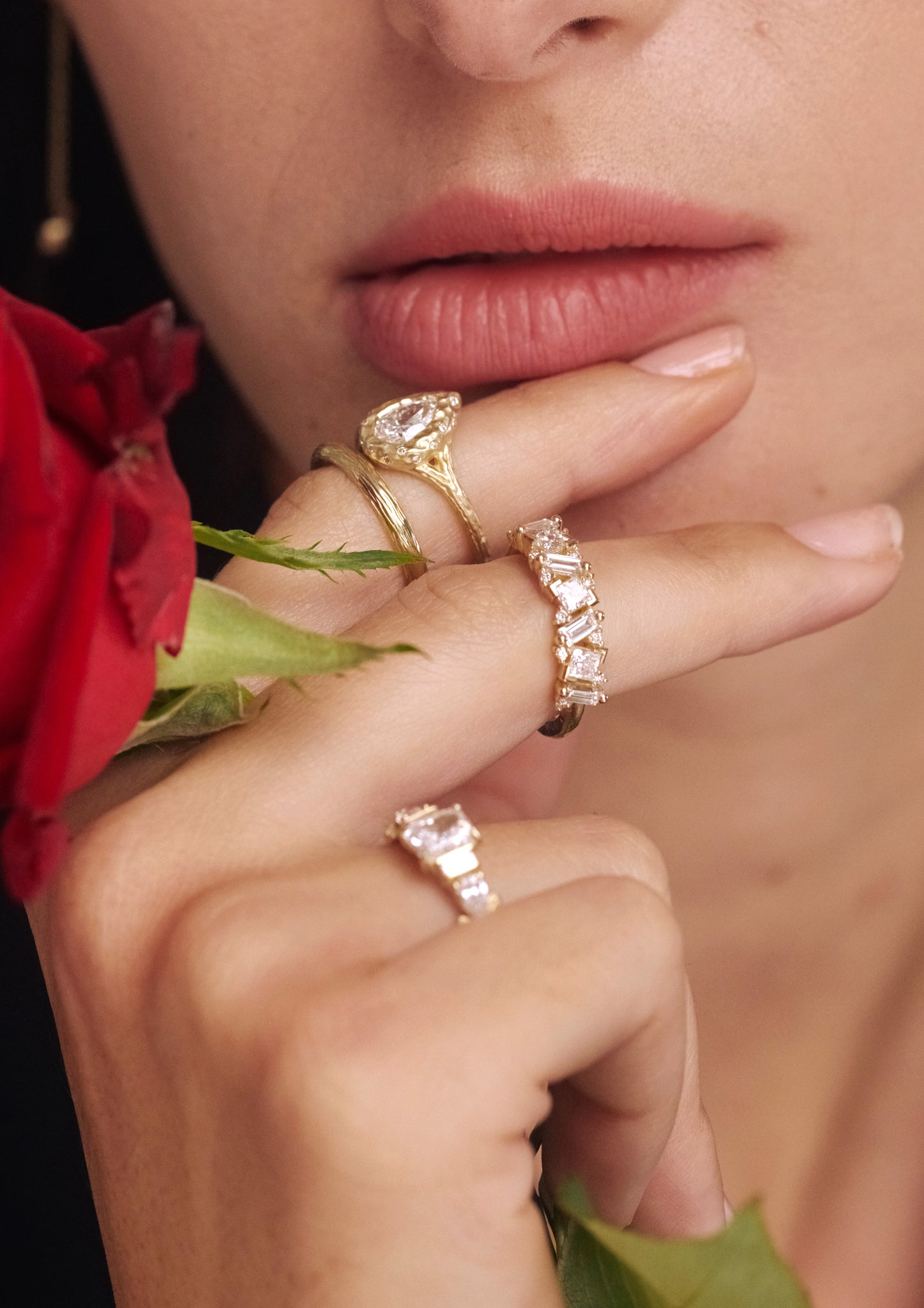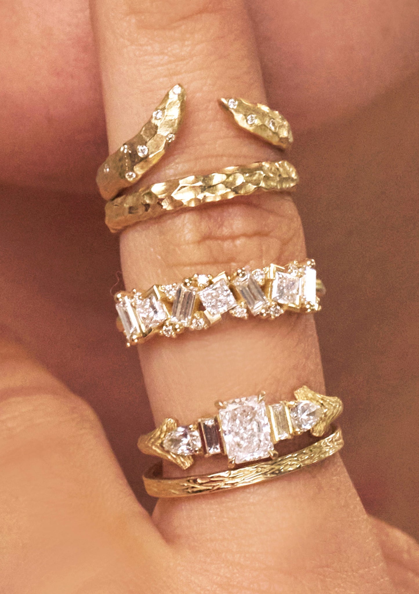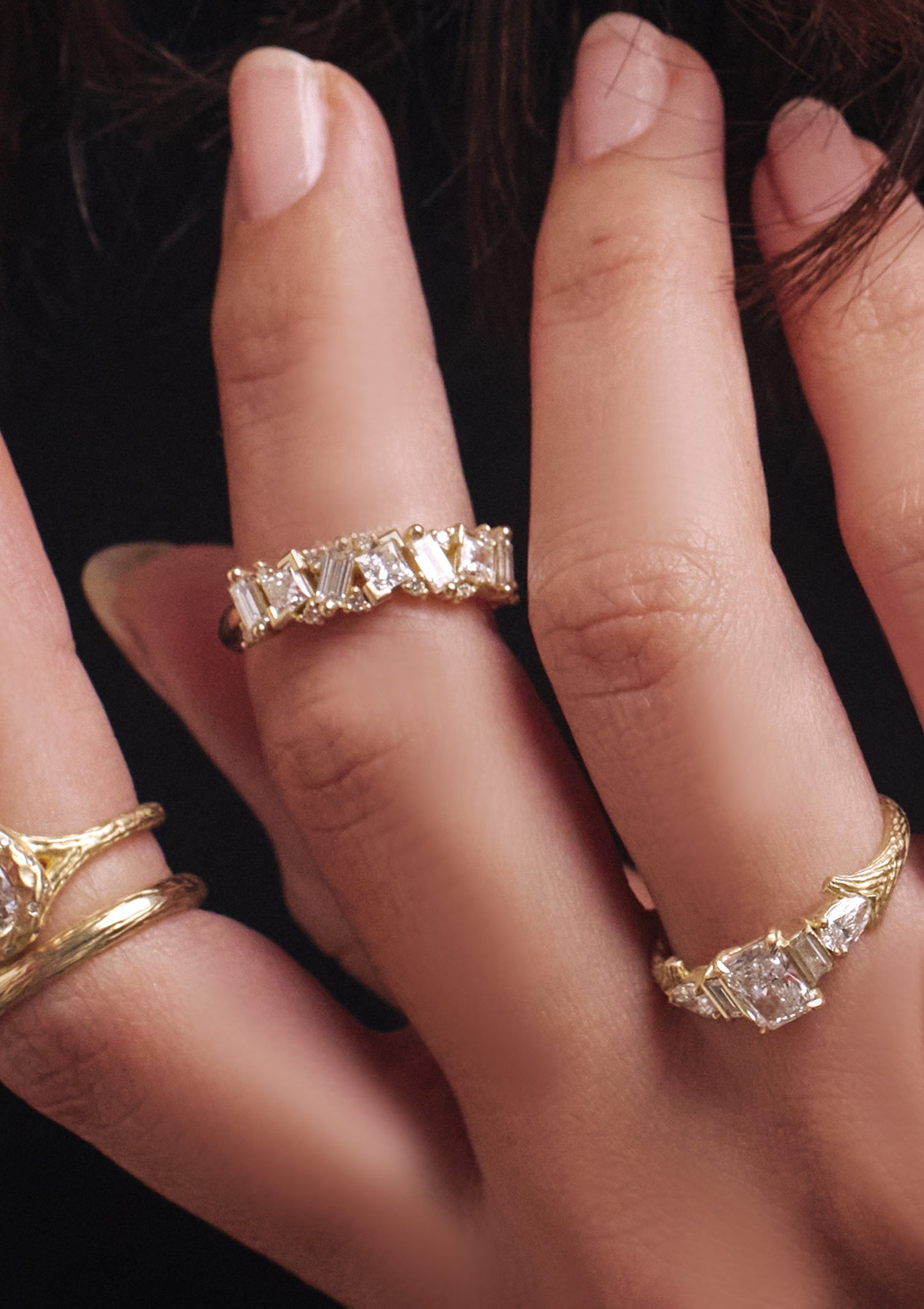 The Iris Ring on the middle finger is a dazzling eternity-style band crafted in gold. It features an alternating pattern of baguette and princess-cut diamonds, each set in a seamless flow that creates rhythm and brilliance all around the ring. Bold yet elegant, the Iris Ring captures both modern geometry and timeless sparkle, making it a statement piece.